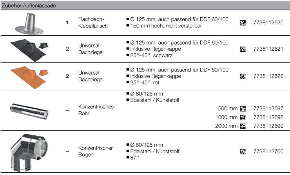 Auswahl-Angebot: Konzentrisches Abgasrohr DN80/125 / Konzentrischer Abgas-Bogen DN80/125 / Konzentrischer Prüfbogen DN80/125 / Konzentrischer Zuluftstutzen DN80/125 / Wandhalterung DN125 / Aussenwandkonsole, Dachdurchführung / Universal-Dachziegel / Dachziegel / Schrägdachpfanne / Flachdachklebeflansch