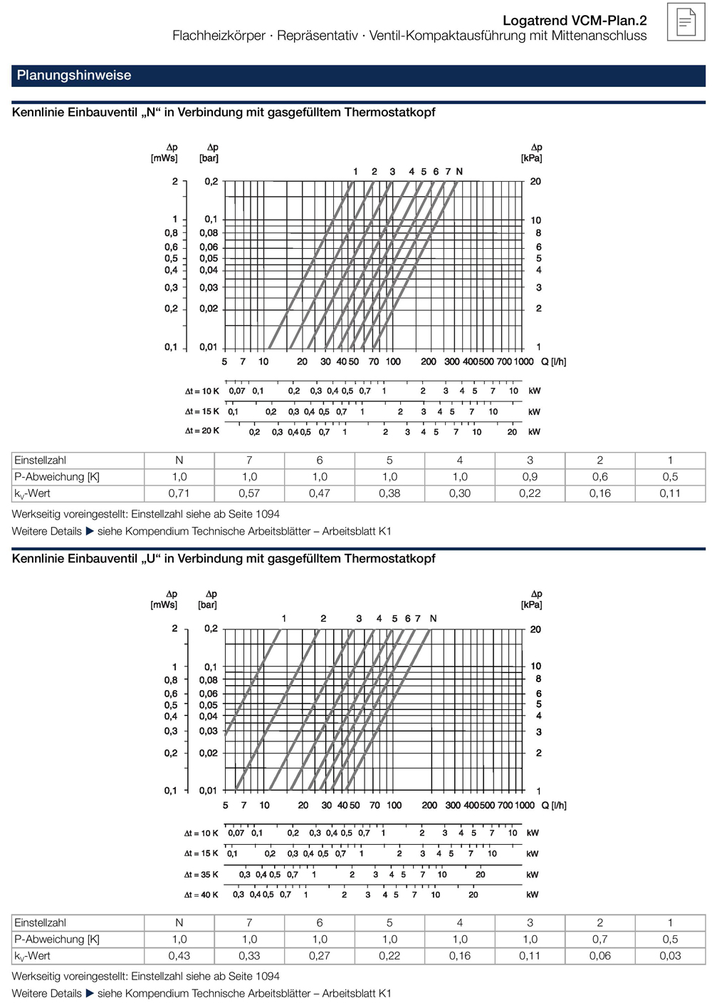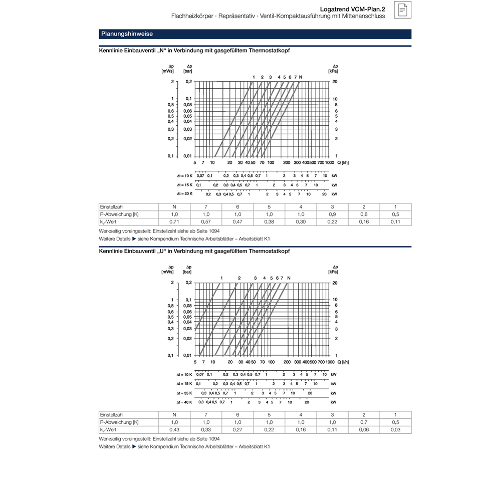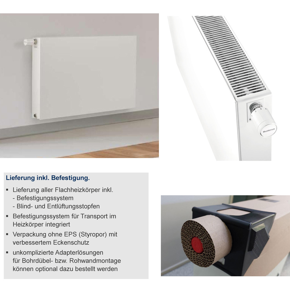 Planer Flachheizkörper aus kaltgewalztem Stahlblech nach EN 442 mit glatter Vorderwand für hohe optische Ansprüche mit Verkleidung in Ventilkompaktausführung mit Mittenanschluss. Integrierte, RECHTS angeordnete Ventilgarnitur für Zweirohrbetrieb sowie Einbauventil, Blind- und Entlüftungsstopfen werkseitig eingebaut. Einrohrbetrieb in Verbindung mit einer Einrohr-Bypass-Armatur. Rohrleitungsanschluss über 2 untere, mittige G 3/4- Außengewinde nach DIN V 3838 für einheitliche Anschlussposition. Hochwertige, umweltfreundliche Lackierung gemäß DIN 55900. Erhöhter Korrosionsschutz durch standardmäßige Lackierung in 3 Fertigungsphasen: Entfettung sowie Phosphatierung, kataphoretische Tauchgrundierung (nicht bei Seitenteilen und Abdeckgitter) und anschließende Einbrenn-Pulverlackierung mit hoher Kratz- und Schlagfestigkeit in RAL 9016 verkehrsweiß. Im Heizbetrieb emissionsfrei. Heizkörper in Schrumpffolie mit Kunststoff-Kantenschutzecken sowie Kartonage als Transport- und Montageschutz verpackt. Vorbereitet für Buderus-Montage-System BMSplus.2. Heizkörperverkleidung bestehend aus Seitenteilen sowie demontierbarem Abdeckgitter. Garantierter Qualitätsstandard mit Registrierung nach RAL-Gütezeichen RAL-RG 618. Wärmeleistung DIN EN 442 geprüft (Prüfstellennummer 1015) mit permanenter Fertigungsüberwachung nach EN-ISO 9001. Je nach spezifischer Wärmeleistung ist hinsichtlich der Regelcharakteristik eines von 2 optimierten Einbauventilen werkseitig (mit Kunststoff-Schutzkappe) eingebaut. Der kv-Wert ist werkseitig voreingestellt und auf die spezifische Wärmeleistung abgestimmt. Die Voraussetzungen zur Förderfähigkeit bezüglich des hydraulischen Abgleichs sind somit erfüllt. Es ergibt sich eine optimierte hydraulische und regelungstechnische Situation. Einfache, schnelle Montage eines Fühlerelements (Thermostatkopf) mittels Klemmanschluss. In Kombination mit einem Gasfühlerelement ergibt sich über den gesamten kv-Wert-Bereich (N-Ventil bis zu 0,71 / U-Ventil bis zu 0,43) eine Auslegungs-Proportional-Abweichung < 1K, was zur Energieeinsparung beiträgt. Gegenüber konventionellen Einbauventilen führt dies zu einem besseren Regelver- halten und bis zu 5 % Energieeinsparung nach DIN V 4701-10. Inklusive Buderus-Montagesystem-Set zur Wandmontage, welches die Anforderungsklassen 1 und 2 gemäß der VDI- Richtlinie 6036 erfüllt.
